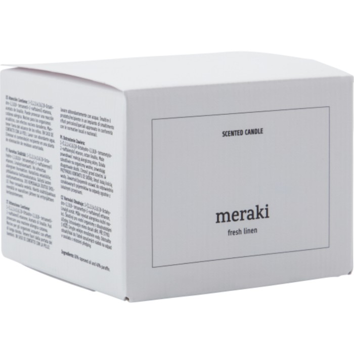 Merakis doftljus Fresh Linen fyller ditt hem med en fräsch doft av nytvättat. Detta doftljus kombinerar uppfriskande toppnoter av citron och apelsin med ett hjärta av jasmin och ros, vilande på en bas av mysk och vetiver. Bomullsveke. Tillverkat i EU