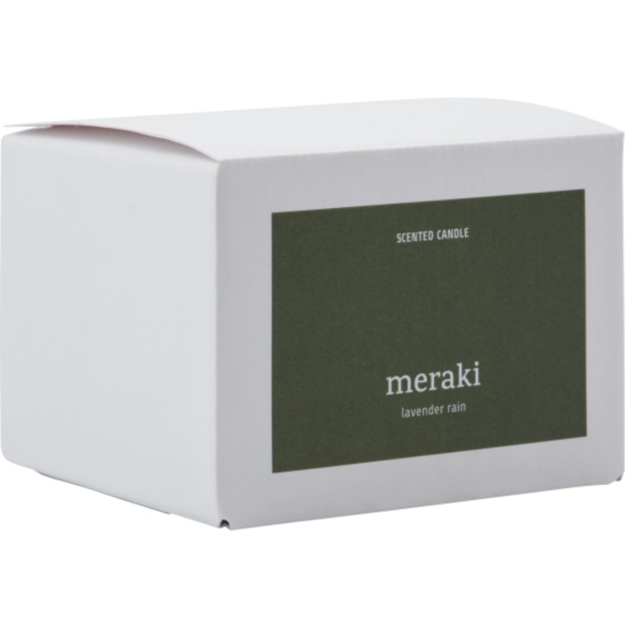Merakis doftljus Lavender Rain skapar en lugn oas i ditt hem. Ljuset har en doft av lavendel, med uppfriskande toppnoter av kamomill och citron, ett hjärta av avslappnande lavendel och en bas av geranium, eucalyptus och patchouli. En doft som kanske passar perfekt för att varva ner efter en lång dag. Bomullsveke. Tillverkat i EU.