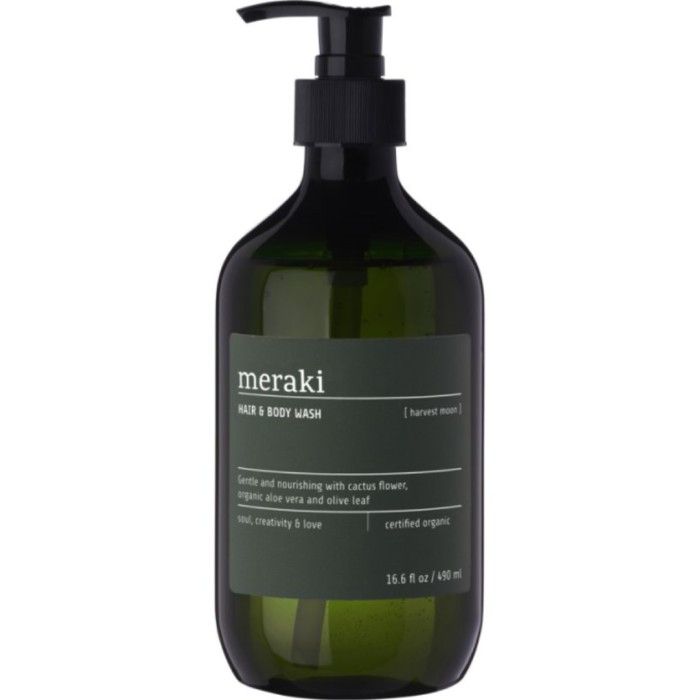 Harvest Moon Hair & Body Wash från Meraki är en kombinerad hår- och kroppstvätt för dig som vill ha en enkel rutin i duschen, med färre produkter. Harvest Moon innehåller extrakt från kaktus, aloe vera och oliver, som återfuktar och ger huden näring. Harvest Moon har en doft av rosmarin. Passar för dagligt bruk och för alla hudtyper.