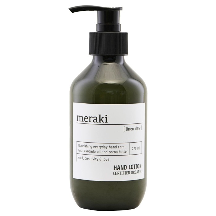 Linen Dew Hand Lotion från Meraki är en handkräm som är ekologiskt certifierad och innehåller ekologisk aloe vera, avokadoolja och kakaosmör. Merakis handlotion vårdar, återfuktar och mjukgör händerna utan att de känns feta. Perfekt att ha stående framme i badrummet eller i köket, ställen där du ofta tvättar händerna.