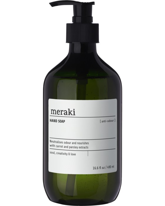Meraki Hand Soap Anti-Odour är en handtvål som passar bra att använda i köket. Tvålen tar bort oönskad lukt från dina händer efter att du hanterat livsmedel som t ex lök, vitlök och skaldjur. Den flytande handtvålen har en lätt blomdoft för att effektivt neutralisera dessa oönskade dofter. Tvålen innehåller betain som stärker hudbarriären och låser in fukt i huden. Kökstvålen innehåller även extrakt från persilja och morot, och gör dina händer rena, mjuka och välvårdade.