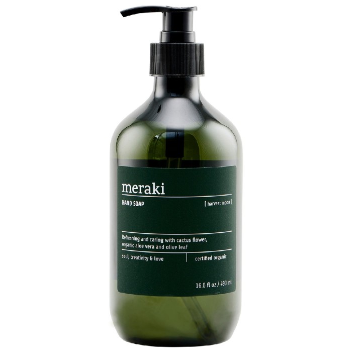 Tvålen kommer i en fin grön flaska, som pryder sin plats därhemma, oavsett om det är i badrummet, köket eller i tvättstugan. Om du gillar doften kan du kompletter med en handkräm från Meraki med samma doft.