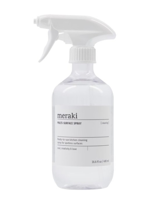 Meraki Multi-Surface Spray köksrengöringsspray kan användas på många olika ytor i hemmet. Kan snabbt hjälpa dig med en sista minuten-rengöring eller användas vid storstädningen. Sprayen har en lätt blommig och citrusaktig doft. Hjälper dig att få fläckfria ytor på bänkskivor i rostfritt stål, på matbordet, dörrhandtag eller diskbänkar. Har en avfettande effekt och passar bra för köket. Spraya bara på ytan och torka av med en mjuk, fuktig trasa. Passar alla tvättbara ytor.