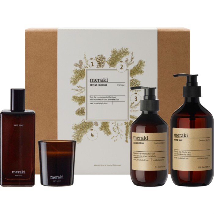 Fin presentlåda från Meraki för adventstiden med en handtvål, en handlotion, ett litet doftljus och en rumsspray. Produkterna har en minimalistisk design och naturliga färgtoner som förmedlar en känsla av skandinavisk enkelhet. En fin låda att ge bort som en gåva.