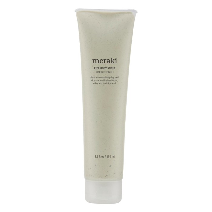 Meraki Rice Body Scrub är en peeling för kroppen som gör huden len. Merakis kroppsskrubb innehåller sheasmör, aloe vera, olivolja och brakvedsolja. Sheasmöret är rikt på E-vitamin vilket ger en lugnande och återfuktande effekt, medan oljorna mjukar upp och stärker hudens elasticitet. Peelingen innehåller naturliga exfolianter av risgranulat som skrubbar huden varsamt och effektivt för att ta bort döda hudceller och stärka hudens naturliga lyster.