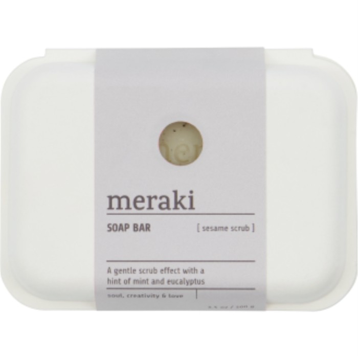 Meraki Soap Bar Sesame Scrub är en tvål med sesamskrubb som ger händerna en mild exfoliering när du tvättar dig. Denna fasta tvål från Meraki avlägsnar döda hudceller, medan essentiella oljor från mint, cederträ och eukalyptus har en lätt svalkande effekt och en uppiggande doft. Kan användas i badrummet eller köket.