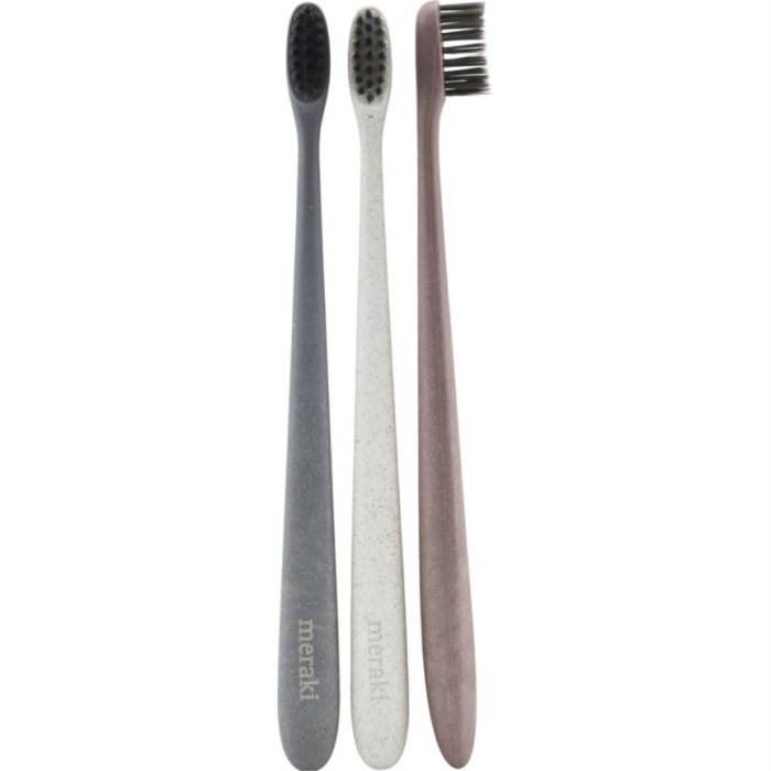 Meraki Tandborstar i 3-pack med en grå, en vit och en vinröd tandborste. För dig som föredrar dämpade nyaner i tandborstmuggen. Tandborstarna har ett skaftet tillverkat av vetehalm och borststrån av nylon. Hårdhet: Mjuk/medium.
