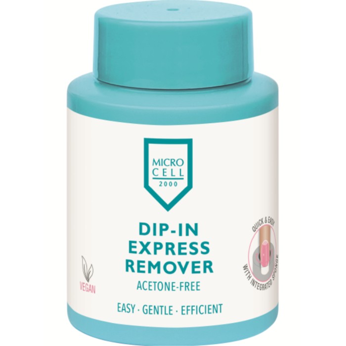 Micro Cell 2000 Dip-in Express Remover är en skonsam, effektiv oc hacetonfri nagellacksremover med i en "dip-in-burk". I burken ligger en svamp indränkt i remover som tar bort nagellack snabbt, och kan användas för att korrigera nagellack på ett finger i taget.