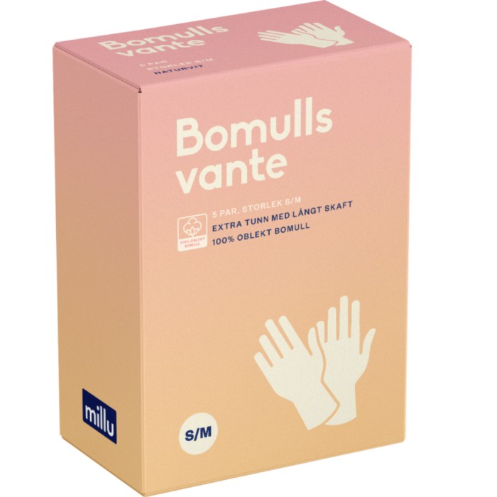 Millu Bomullsvante är en oblekt, tunn vante med extra långt skaft tillverkad av 100% bomull. Bomullsvantarna kan användas som skydd efter insmörjning av händerna, vilket kan passar bra om du har mycket torra händer. Vantarna kan också används som innerhandskar under vattentäta handskar såsom skyddshandskar och hushållshandskar. Lämpliga även som innerhandskar för transport av fukt från huden, för att undvika hudskador eller isolera mot kyla.
