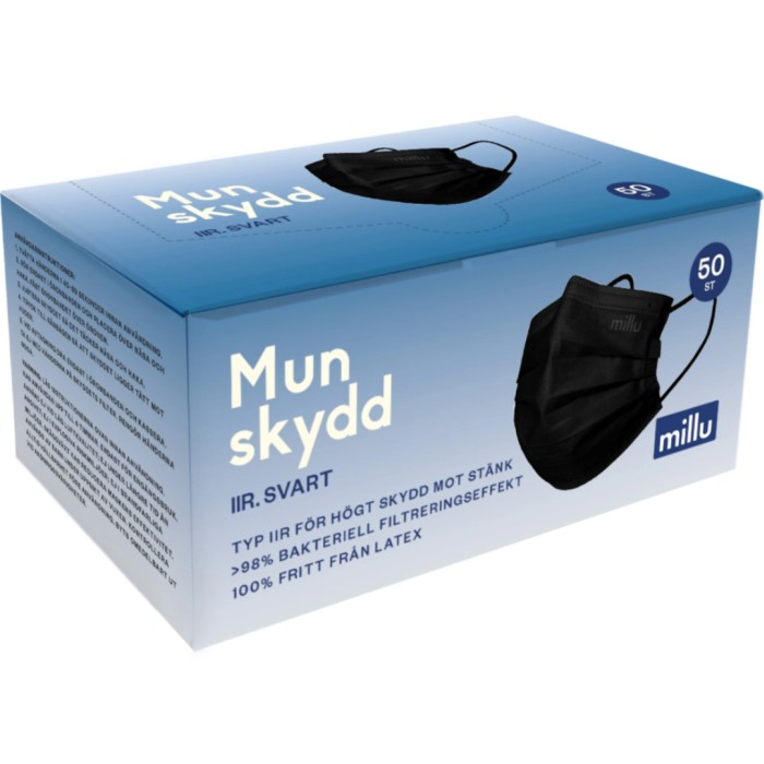Millu IIR är ett bekvämt kirurgiskt munskydd med tre lagers skydd som filtrerar minst 98% av bakterier (BFE). Munskyddet har ett mjukt ytterskikt som ger hög komfort. Munskydd IIR används för att förebygga spridande av infektioner genom att fånga upp patogener som utsöndras som flytande droppar och partiklar från bärarens utandningsluft. Skyddar även bäraren från stänk av potentiellt kontaminerad vätska. 50-pack.