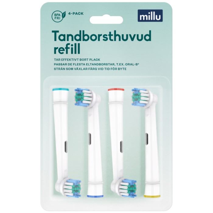 Millu Refill-tandborsthuvud till eltandborste är utvecklade för optimal rengöring av tänderna och effektiv borttagning av plack. Borstens strån är rundade för skonsam rengöring av tänder och tandkött.