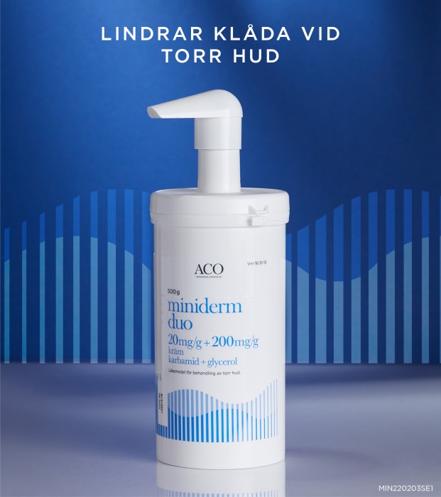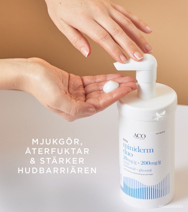 Miniderm Duo är en fuktighetsbevarande och mjukgörande kräm för behandling av torr hud. Hudkrämen lämpar sig för barn i alla åldrar och vuxna med torr hud, och passar för hela familjen. Miniderm Duo innehåller en kombination av de fuktighetsgivande ingredienserna karbamid (2%) och glycerol (20%). Dessa ingredienser i krämbasen både mjukgör huden och stärker hudbarriären. Miniderm Duo har visat sig ha en barriärstärkande effekt även för personer med atopiskt eksem. Miniderm Duo kräm är parfymfri och självkonserverad, vilket betyder att den är utan konserveringsmedel. Den är vältolererad och lämpar sig även för bebisar, små barn och vuxna med känslig hud. Finns även i en tub med 100 g. Läs bipacksedeln noga innan användning.