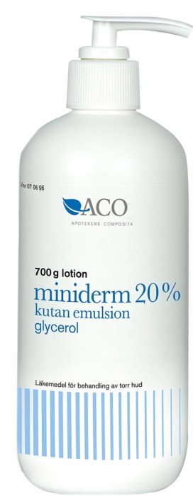 Miniderm används för att behandla torr hud. Miniderm innehåller 20 % glycerol i en mjukgörande lotion (kutan emulsion). Glycerol har vattenbindande egenskaper, vilket bidrar till normalisering av torr hud.