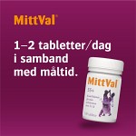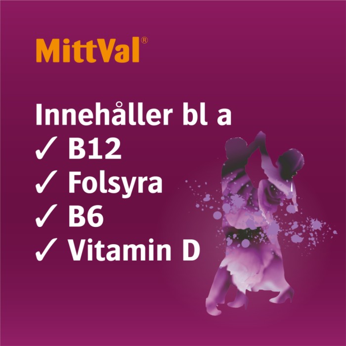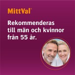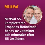 MittVal 55+ är ett kosttillskott och multivitamin särskilt anpassat för dig som är 55 år eller äldre. Den sockerfria tabletten innehåller vitaminer och mineraler som B12, D-vitamin och kalcium. Detta är ett kosttillskott utvecklat med fokus på näringsbehovet efter 55 år.
