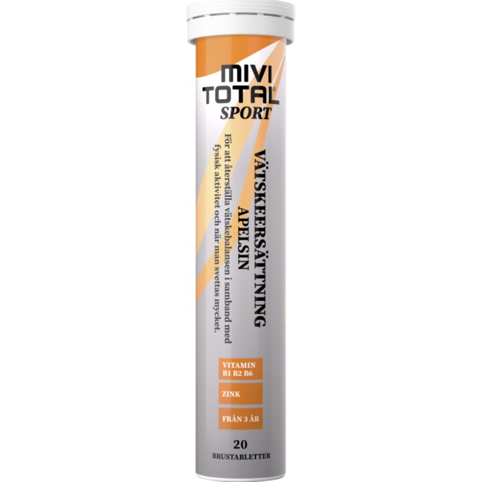 Mivitotal Sport Vätskeersättning med frisk smak av apelsin. Vätskeersättning förbättrar vattenupptaget vid fysisk aktivitet och bidrar till att bibehålla uthållighetsprestationen under långvarig uthållighetsträning. Vätskeersättning kan också användas vid diarréer och kräkningar för att tillföra vätska och salter till kroppen. För vuxna och barn från 3 år. Brustablett som löses upp i vatten.