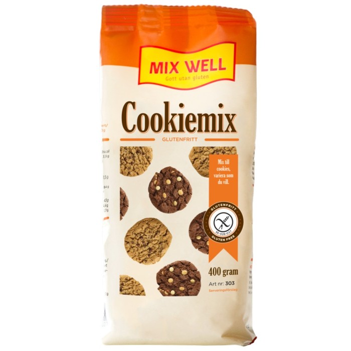 Med Mixwells Cookiemix kan du enkelt baka härligt sega och goda cookies. Mixen är baserad på glutenfria råvaror som bl a ris. Blanda mixen med vätska, sirap och fett - samt om så önskas choklad, nötter eller andra godsaker.
