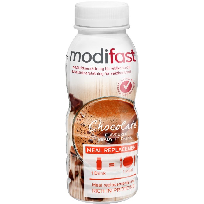 Modifast Ready to Drink med en fyllig smak av choklad. Modifast Ready to drink är färdigblandad i en praktisk, återförslutningsbar flaska och är en fullvärdig måltidsersättning. Du kan använda Modifast RTD för att minska eller kontrollera din vikt genom att byta ut en eller ett par vanliga måltider om dagen med Modifast - dock inte alla.