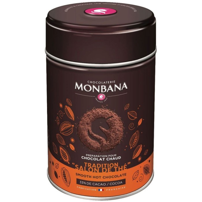 Monbana Chocolaterie Chokladpulver "Salon de Thé" är ett varmchokladpulver med 32% kakaohalt avsett för drycker. Pulvret ligger i en fin presentburk.