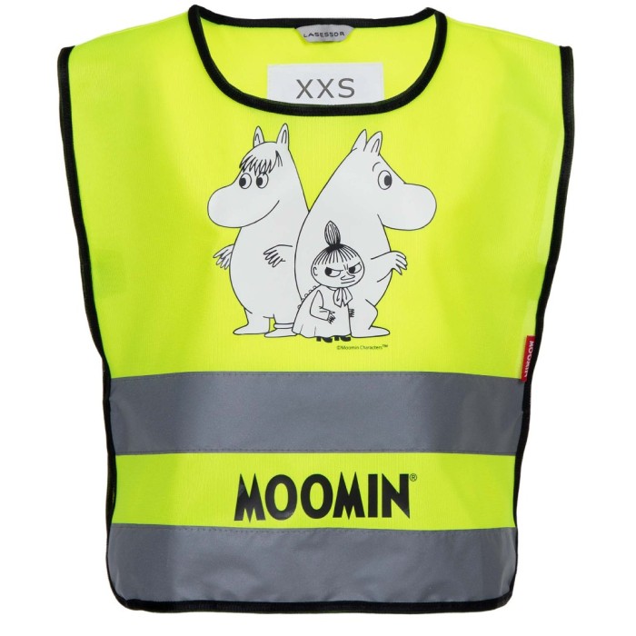 Reflexväst med Mumin-motiv, storlek XXS för barn 4-5 år. Gör att barnet syns bättre i mörkret.