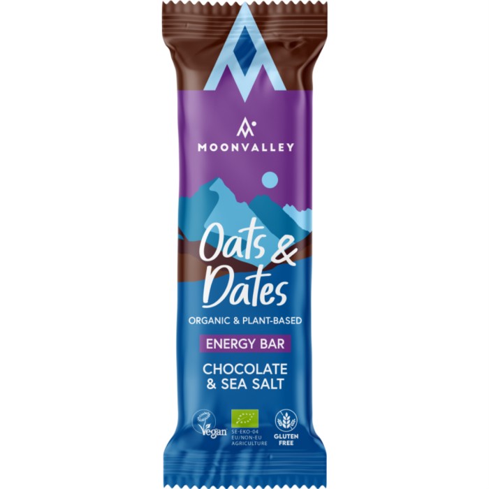 Moonvalley Oats & Dates Energy Bar Chocolate & Sea Salt är en energibar med smak av choklad och havssalt. En bra liten energikälla att ta med på en lång dag ute i naturen, som ett mellanmål, eller till fikapausen, eller för att ta dig den där sista biten i mål på en tävling. Glutenfri. Vegansk.