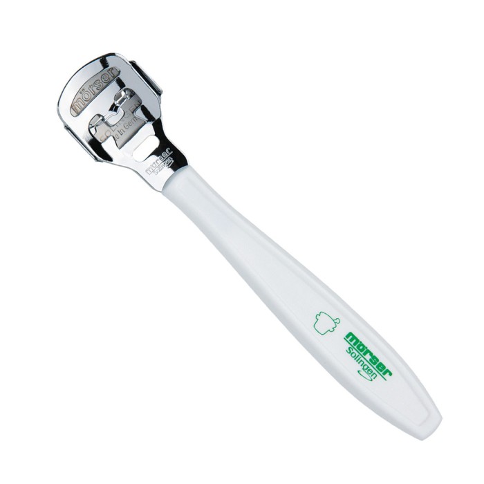 Mörser Solingen Förhårdnadshyvel används för att ta bort hård hud på fötterna. Förhårdnadshyveln har ett rakblad av härdat stål och avlägsnar kraftiga förhårdnader.