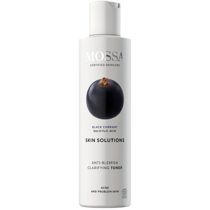 Mossa Skin Solutions Anti-Blemish Clarifying Toner är ett ansiktsvatten som motverkar orenheter och balanserar talgproduktionen med BHA-syra och avlägsnar döda hudceller med AHA-syra. Mossa Clarifying Toner rengör huden och gör att porerna ser mindre ut. Med svartbärsextrakt som förbättrar hudbarriären och hudens återfuktning.