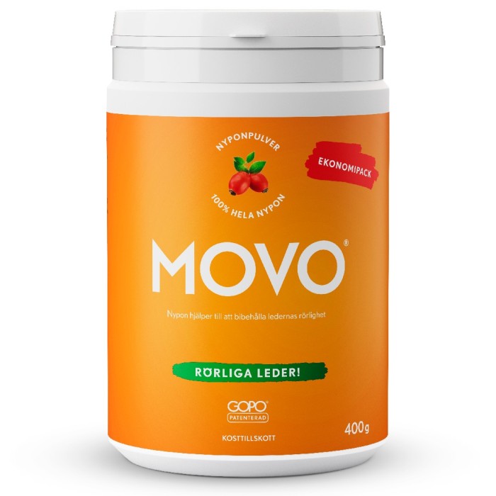 MOVO nyponpulver är ett kosttillskott som innehåller det väldokumenterade GOPO. Nyponen i MOVO har ett naturligt innehåll av antioxidanten C-vitamin som bidrar till att skydda cellerna mot oxidativ stress. C-vitamin bidrar även till normal kollagenbildning som har betydelse för broskets normala funktion.