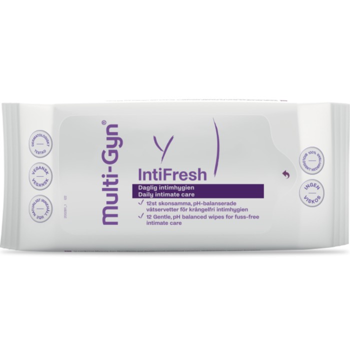 Multi-Gyn IntiFresh är intimservetter med den bioaktiva molekylen 2QR som neutraliserar oönskade bakterier. Våtservetterna ligger i en praktisk liten förpackning som är lätt att ha med sig i väskan på resan eller på jobbet.