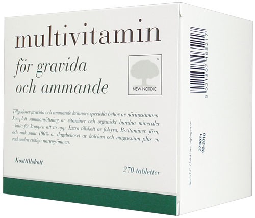 Multivitamin för gravida och ammande är en komplett, daglig multivitamin- och mineraltablett före, under och efter graviditeten. Tillgodoser den gravida och ammande kvinnans speciella behov av näringsämnen. Höga halter av folsyra, järn, kalcium och vitamin E.