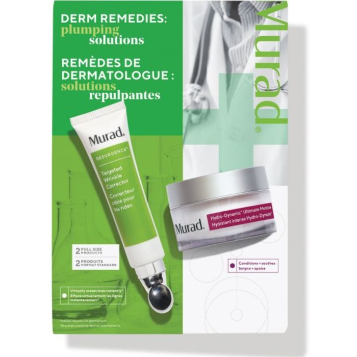 Murad Derm Remedies Plumping Solutions är ett kit med två utslätande och plumpande full size-produkter. Kitet innehåller: Targeted Wrinkle Corrector (15 ml) och Hydro-Dynamic Ultimate Moisture (50 ml).