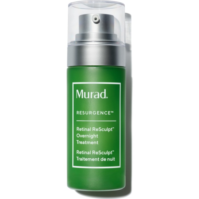 Murad Retinal ReSculpt Overnight Treatment är ett innovativt uppstramande serum med retinal – en av de mest effektiva formerna av A-vitamin. Inkapslad retinal förbättrar stabiliteten vilket möjliggör en djupverkande och snabb effekt. Serumet är kliniskt bevisat att strama upp och jämna ut linjer på två veckor samtidigt som det förbättrar hudens elasticitet på 4 veckor. Murads serum har en formulering som är framtagen för att samtidigt återfukta på djupet för en skonsam effekt och en mjukare, jämnare hud. Används på kvällen.