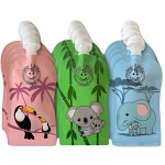 Återanvändbara klämmisar från My Little Meal. Förpackningen innehåller totalt 6 st påsar á 180 ml i en mix av tre olika motiv: Koala, Elefant och Tukan.
