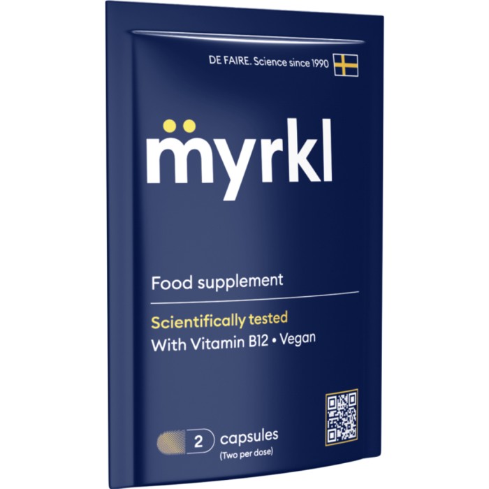 Myrkl är ett kosttillskott som innehåller de Faire Medicals patentansökta AB001™-formulering, med bakteriekulturer och aminosyror (L-cystein). Myrkl är berikad med vitamin B12, som bidrar till att minska trötthet och utmattning. Vegansk.