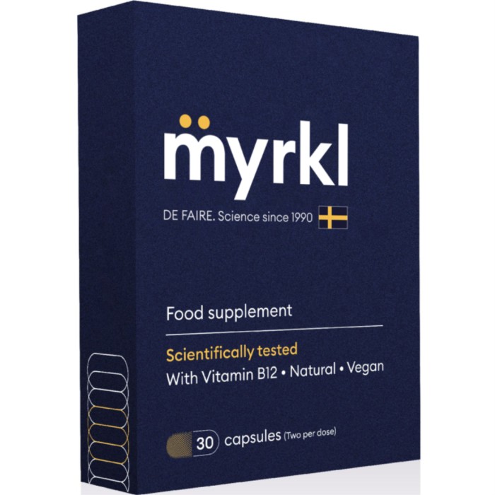 Myrkl är ett kosttillskott som innehåller de Faire Medicals patentansökta AB001™-formulering, med bakteriekulturer och aminosyror (L-cystein). Myrkl är berikad med vitamin B12, som bidrar till att minska trötthet och utmattning. Vegansk.