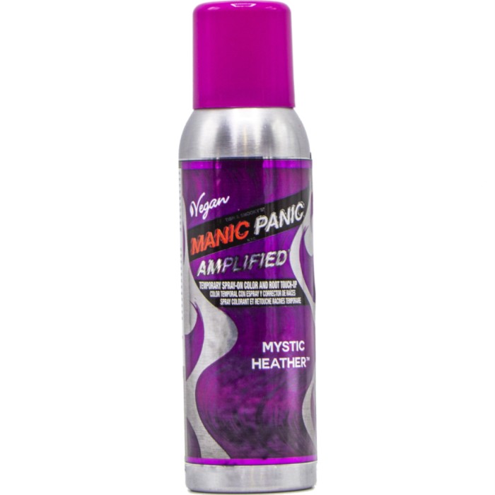 Manic Panic Color Spray Mystic Heather är en tillfällig färgande hårspray i en snygg lila nyans. Den här tillfälliga färgen passar perfekt till skapa färgstarka slingor, festivalflätor, fräscha upp utväxt eller en allmän färguppdatering. Om du har funderat på att färga håret i den här nyansen, kan det vara en idé att prova den här tillfälliga varianten först för att se hur du trivs. Tvättas enkelt bort efter användning.
