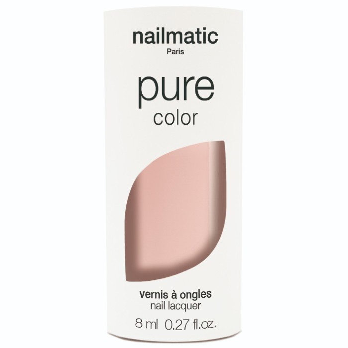 Pure-nagellacken från franska Nailmatic är berikade med vegetabiliskt keratin och borageolja (gurkörtsolja) för att bidra till friska naglar. Färgen består av naturliga och/eller organiska färger beroende på nagellackets färg/nyans.