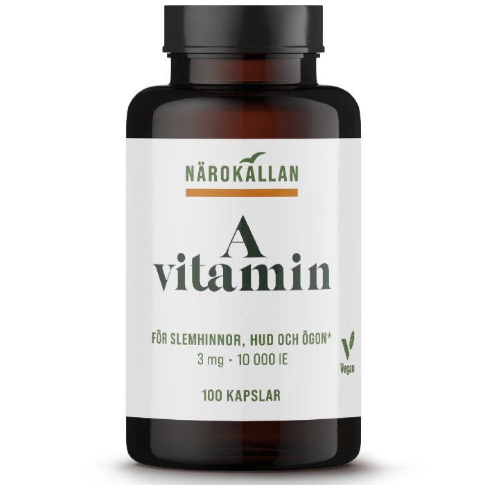 Närokällan A-vitamin är ett kosttillskott med A-vitamin som består av Retinylpalmitat, en form som tas upp av kroppen direkt. A-vitamin bidrar till immunsystems normala funktion, till normal hud och normala slemhinnor samt till att upprätthålla en normal syn.