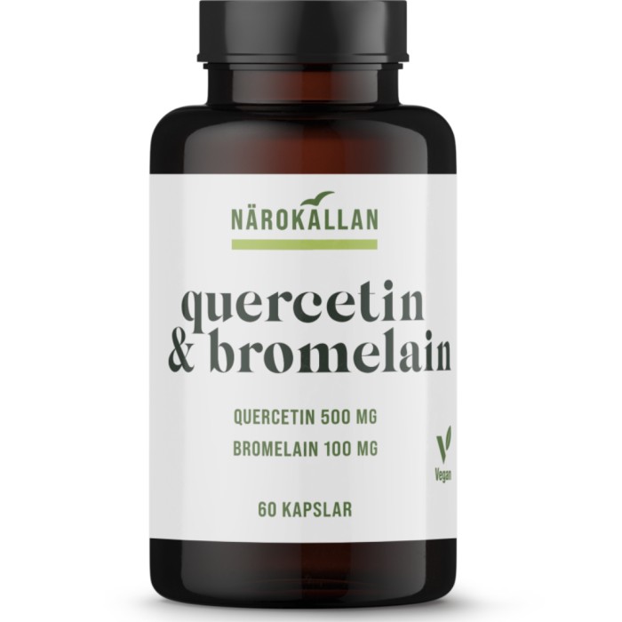 Närokällan Quercetin & Bromelain är ett kosttillskott med en blandning av Quercetin (ett växtämne) och Bromelain (ett enzym). Quercetin är en flavonoid från växter, ett gult pigment som förekommer naturligt i många växter, t ex i ek och äpple. Bromelain är ett protein-enzym från ananas.