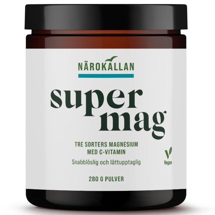 Super Mag pulver från Närokällan är ett kosttillskott med tre olika former av magnesium i lättlöslig pulverform. Pulvret innehåller även C-vitamin.