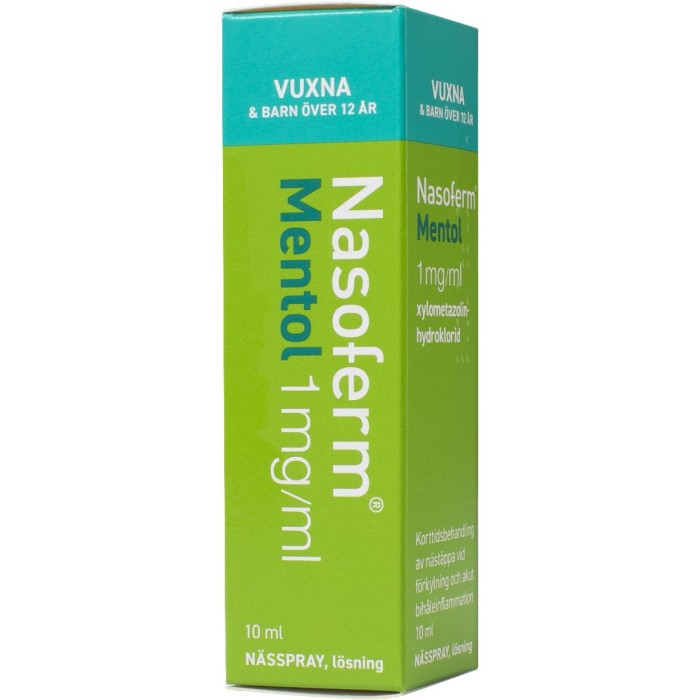 Nasoferm Mentol nässpray 1 mg/ml är en avsvällande nässpray med mentol för vuxna och barn från 12 år. Nässprayen används mot nästäppa vid förkylning och akut bihåleinflammation. Ger snabb effekt som varar 10 timmar eller hela natten.