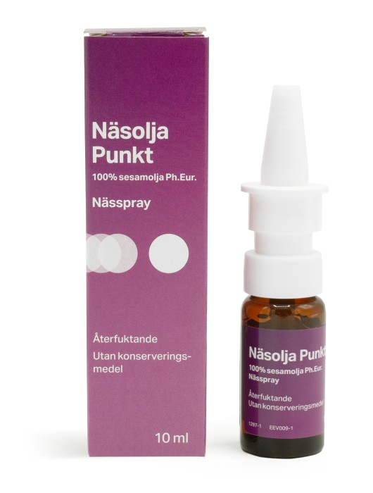 Näsolja Punkt är en naturligt återfuktande och mjukgörande spray för torra slemhinnor i näsan. Näsoljan består av 100 % sesamolja som återfuktar och mjukgör torra näsgångar. Lindrar irriterande näsbesvär, torra slemhinnor och klåda.