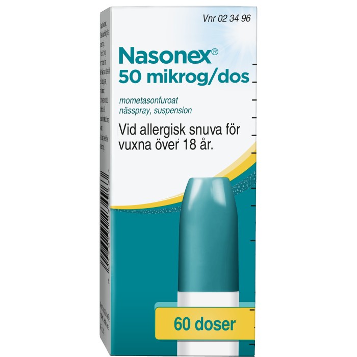 Nasonex innehåller den aktiva substansen mometasonfuroat som kan hjälpa till att lindra näsbesvär så som inflammation (svullnad och irritation), nysningar, klåda eller nästäppa. Nasonex får användas från 18 års ålder.
