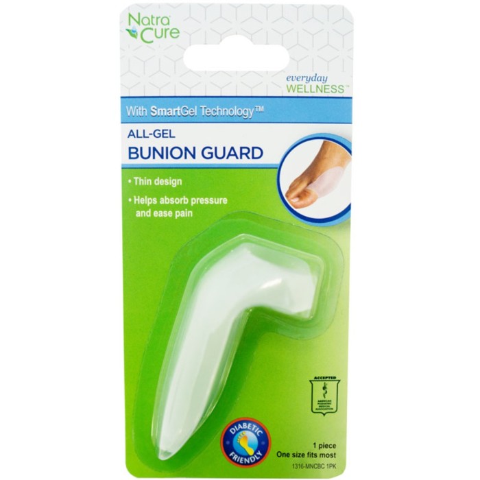 NatraCure All-Gel Bunion Guard är ett Hallux Valgus-skydd med en patenterad design som används för att lindra smärta vid fotknölen vid Hallux Valgus. Skyddet absorberar tryck och skyddar från friktion mellan foten och skon. Skyddet är tillverkat av ett diabetesvänligt, mjukt, mycket stötdämpande och töjbart material av 100% medicinsk mineralolja. Innehåller vitamin E och aloe vera för att skydda och återfukta huden.