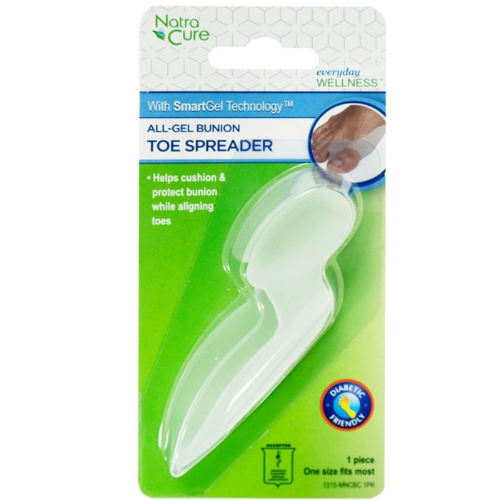 NatraCure All-Gel Bunion Toe Spreader är ett hallux valgus-skydd med tådelare som kan användas för att räta upp felställning av stortån. Det mjuka skyddet lindrar smärta vid fotknölen och skyddar knölen från skav och tryck från friktion mellan fot och sko. NatraCure använder en gel i patenterad design tillverkad av medicinsk mineralolja med vitamin E och aloe vera som skyddar huden. Skyddet är diabetesvänligt, mjukt, stötdämpande och töjbart.