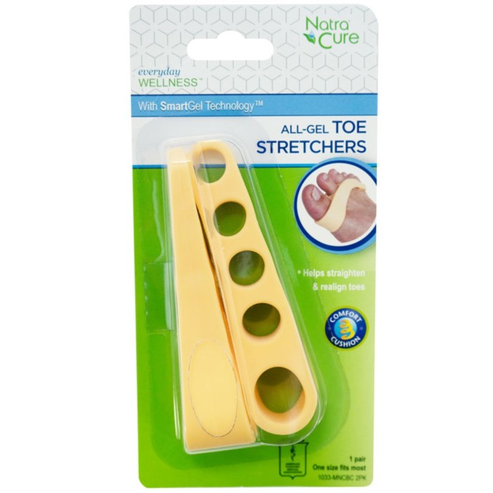 NatraCure All-Gel Toe Stretchers är tådelare som kan användas för att räta ut och justera problemtår samtidigt som flexibiliteten och cirkulationen förbättras. Tådelaren, som också kallas Yoga Stretch- och tådelare, lindrar smärta och spänningar i tår, trampdyna och fotmuskler. Kan även lindra problem vid hammartå och hallux valgus.