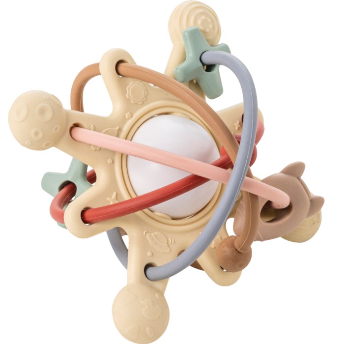 Nattou Soft Silicone Galaxy är en bitleksak i silikon som kan ge lindring åt kliande tandkött. Den lekfulla designen med stjärnor och planeter uppmuntrar bebisen att utforska, bita och suga på de många detaljerna och strukturerna. I mitten finns en "sol" med skallra. Formen och storleken på bitleksaken passar det lilla barnets händer perfekt och låter bebisen träna såväl gripreflex som finmotorik.