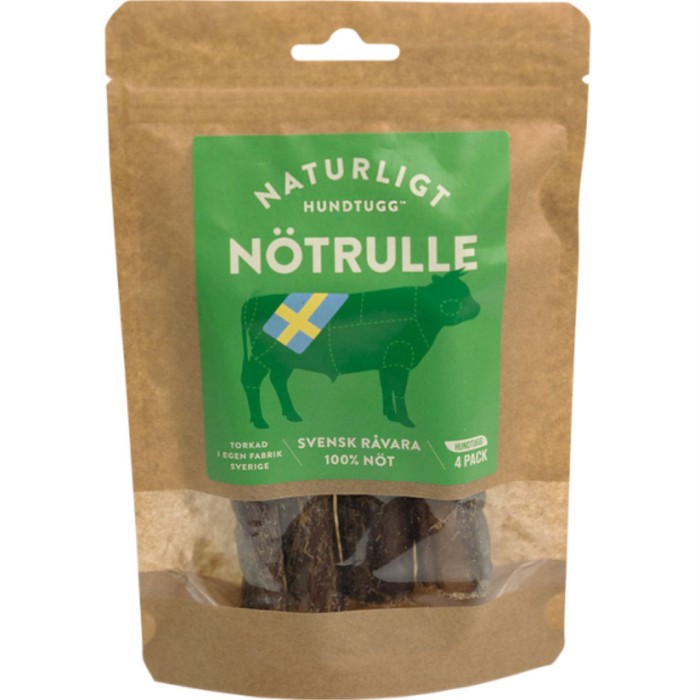 Naturligt Hundtugg Nötrulle är gjort på 100 % svensk råvara. Tuggandet kan främja en god tandhälsa och ett friskare tandkött hos hunden, och tuggandet kan hålla hunden sysselsatt en stund.