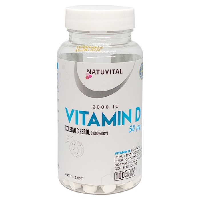 Natuvital Vitamin D är ett kosttillskott med 50 µg kolekalciferol (vitamin D3) och 2000 IU per tablett (motsvarar 1000% av dagligt referensintag). D-vitamin bidrar till att bibehålla normal benstomme, normal muskelfunktion, normala tänder och till immunsystemets normala funktion.
