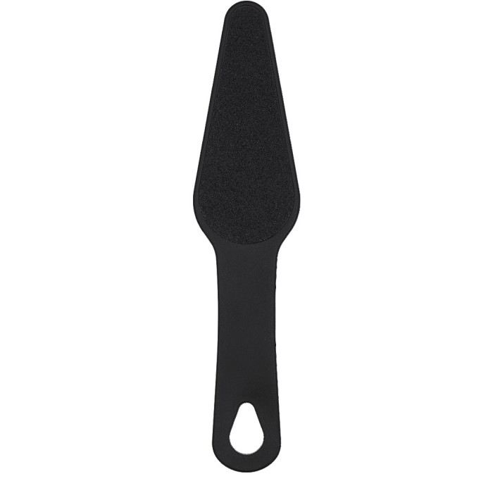 Fotfil med två sidor och ett handtag av plast. Den ena sidan har en finare slipyta och den andra har en grövre.