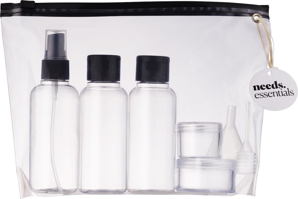 Reseset med tomma flaskor som du kan fylla inför resan. Flaskorna ligger i en påse som går att försluta.
